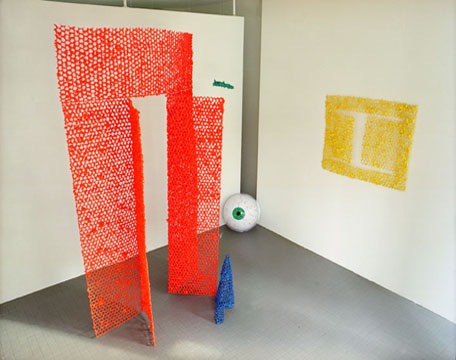 Pure Feeling displays red, blue and yellow drips on a mound of white shredded material. Monumental in title but irreverent in meaning, this doll-like 2 1/2 inch sculpture, tucked in a corner, drips with primary color irony as Liz-N-Val share their skeptical take on the resurgence of abstract painting being rediscovered by a new generation.
